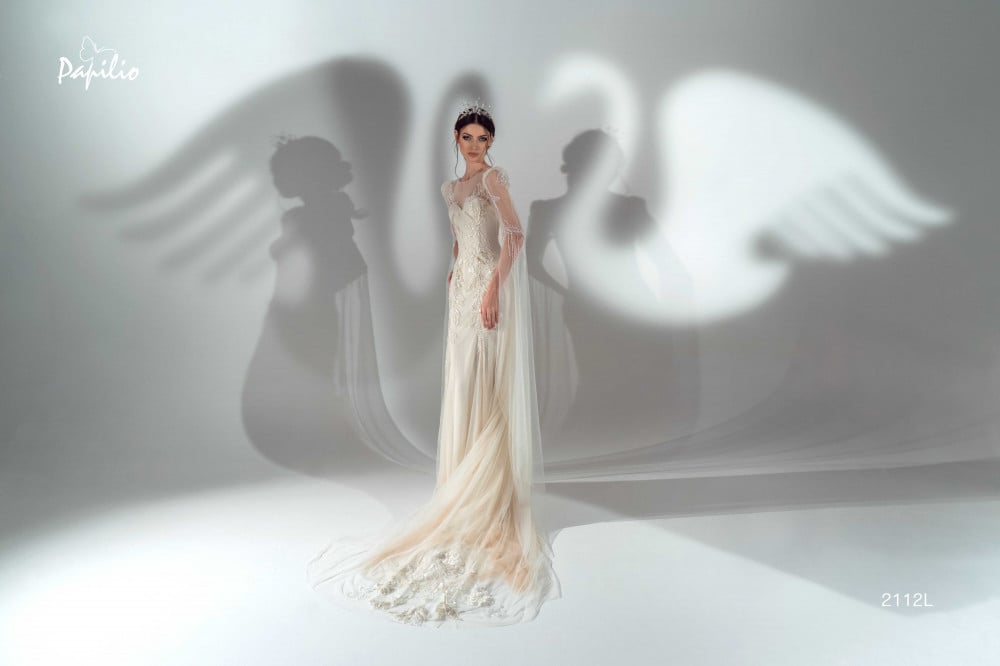 فستان الزفاف هذا للعروس الهادئة والرومانسية والرائعة حقًا. تظهر الخيوط المزيّنة بالخرز والتطريز بالأزهار في جميع أنحاء هذه الصورة المتناسقة ، في حين أن الأكمام الطويلة الشفافة ذات الأكتاف الممتدة هي النقطة المحورية المذهلة في فستان الزفاف هذا.