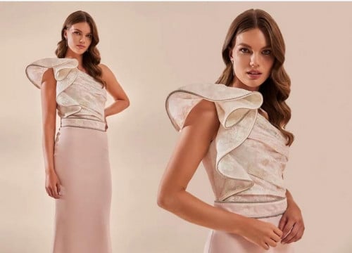 فستان طويل ماسك باكمام منفوخة مزين بالورود
