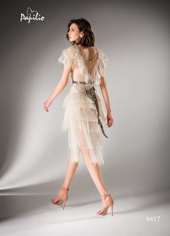 This vintage-inspired cocktail dress with a tiered skirt and deep V neckline is full of intricate details like dramatic lace over the dropped fitted bodice. The dress features a sheer patterned skirt on top of the short lining and is finished with a slim velvet belt and buttons down the illusion back.