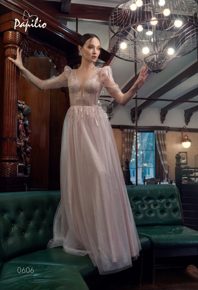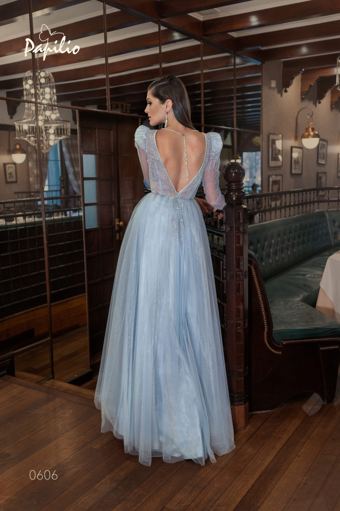 يتميز فستان فخم طويل بقصة A line لتبرز جمال قوامك يُكمل تطريز الأزهار بالخرز المطرز يدويًا تضيف لمسة من الأناقة والفخامة الذي يتدرج إلى أسفل التنورة يأتي الفستان بفتحة صدر عميقة على شكل v و يتميز ظهر الفستان بفتحة كبيرة محددة بخرز مطرز يدويا و يأتي الفستان بأكتاف منفوخة وأكمام طويلة لتضفي لمسة من الرقي والجمال علي الفستان