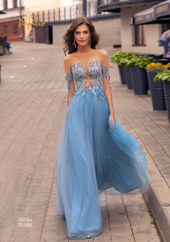 If you want to rock a look that is a little more unique at your next event, this stunning A-line formal dress is the perfect pick. The bodice of the gown is made from illusion fabric, and embellished embroidery covers the chest and sleeves in an off the shoulder style. Watch the flowy skirt of this gown dance with your every movement