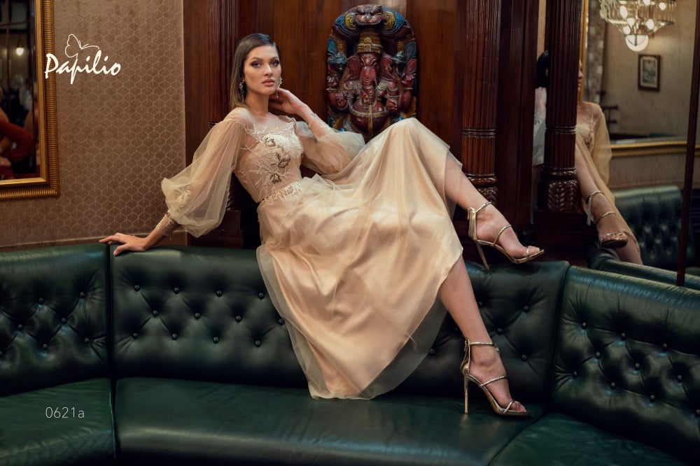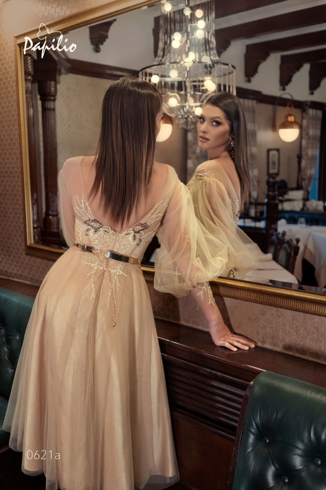 فستان ميدي فخم بقصة A-line تعطيه لمسة من الفخامة والرقي و تفاصيل الصدر المطرز بالخرز المتلألئ تضيف لمسة من الأناقة والتألق و فتحة الظهر على شكل V تضيف للفستان جاذبية خاصة و اكمامه المنفوخة التي تزيده جاذبية و يتميز الفستان بحزام معدني وتطريز يدوي فريد من نوعه كلمسة نهائية مثالية