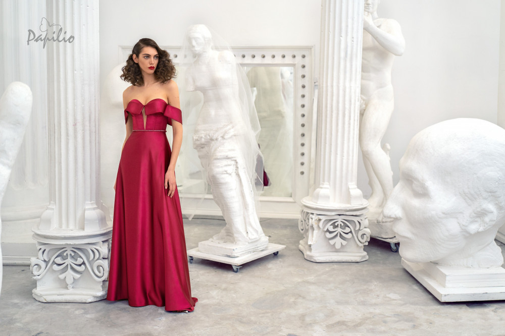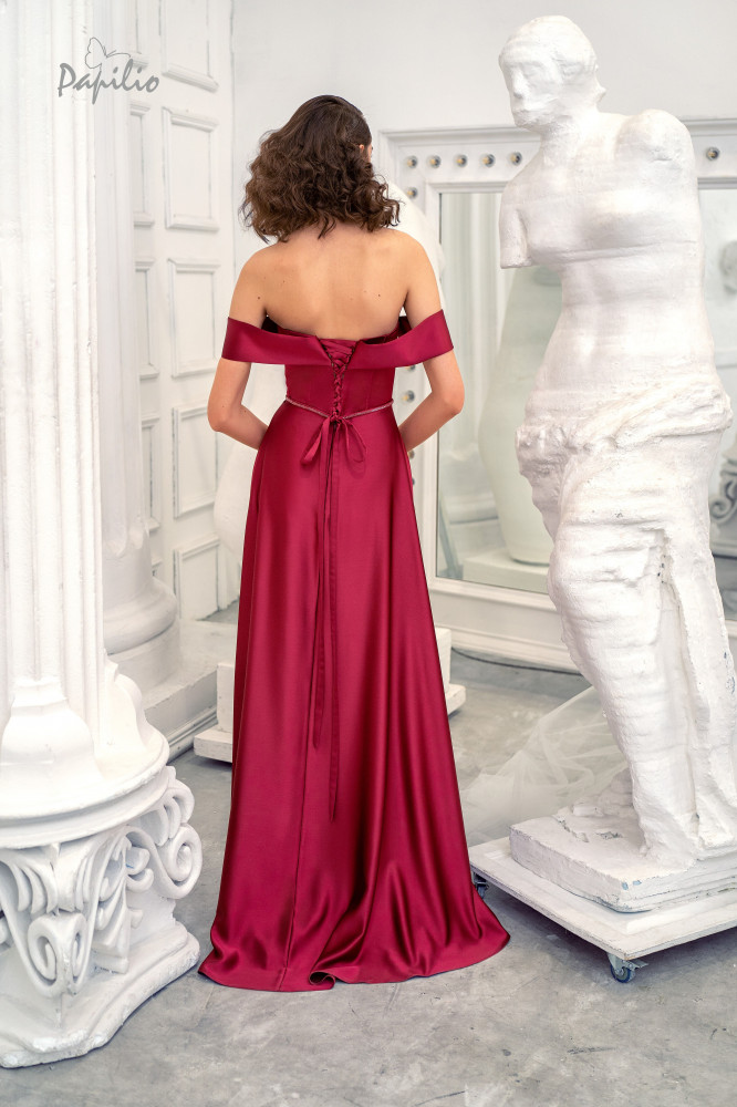 فستان ستان اوف شولدر يأتي باللون الرماني او الزيتي بقصة A LINE يتميز بصدرية بدون حمالات على شكل قلب من الاعلي مع فتحة انيقه عند البطن و أشرطة مكشوفة الكتف و يتميز ظهر الفستان انه على شكل مشد و يتم إغلاقه بأربطة مما يعزز من جاذبيته وسحره وتنورة الفستان المناسبة على الجسم بشكل ناعم
