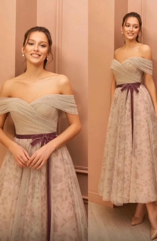 يتميز فستان اوف شولدر منفوش بقصة A-line التي تتسم بأناقتها ورشاقتها و يتميز بتصميم Off-shoulder مما يضفي لمسة من الجاذبية على الإطلالة يتميز الفستان بطبعة الزهور التي تضفي عليه لمسة من الحيوية والأنوثة و يصل طول الفستان حتى الكاحل و يأتي مع حزام مما يعزز من جمال الخصر ويضيف لمسة من التميز والأناقة إلى الإطلالة.